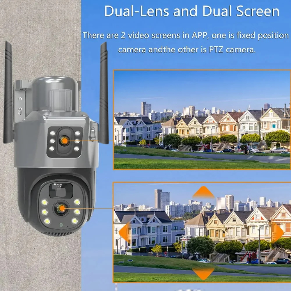 Équipée d’un système à double objectif et double écran, cette caméra combine deux lentilles haute définition pour offrir une résolution totale de 10 mégapixels (5MP + 5MP). Les deux flux vidéo peuvent être affichés simultanément, permettant une surveillance plus complète et précise de la zone.
